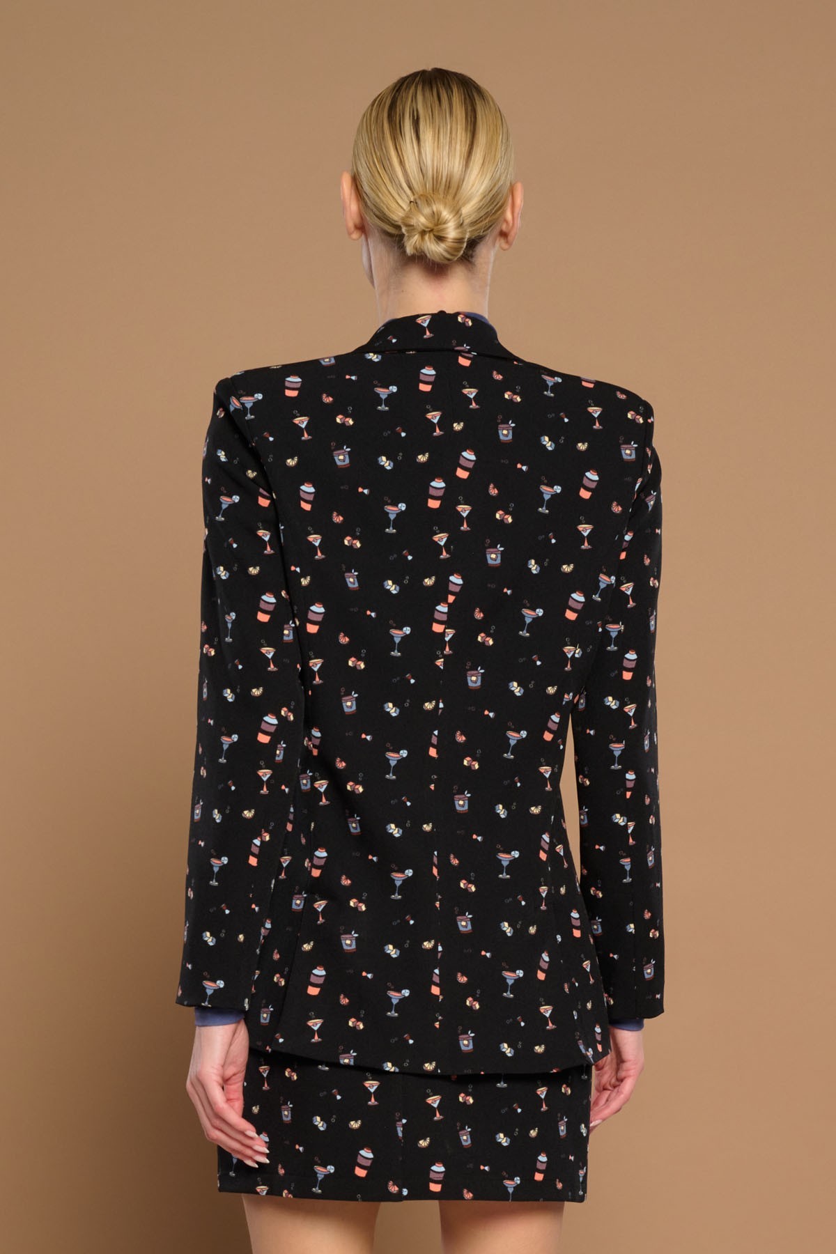 Blazer entallada con cuello solapa y manga larga acabada en abertura y botones. Bolsillos con solapa en delantero. Forro interior a tono. Cierre frontal con botones. Estampado coctel.