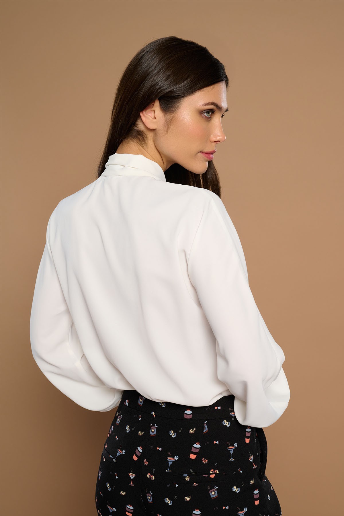 Blusa con lazada al cuello y manga larga con puños ajustados. Cierre con botones en frontal. Tejido fluido.